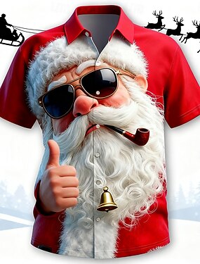 Новогодняя тематика Муж. Дед Мороз Человеческое лицо смешное рождество Рубашка Кнопка рубашка С короткими рукавами Веселая на открытом воздухе Праздники Лето Весна Отложной 3D