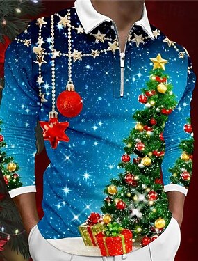 рождество мужская новогодняя елка 3d молния поло дерево повседневная молния гольф длинный рукав для улицы повседневная уличная одежда осень&зимняя 3D-печать отложной воротник молния синий