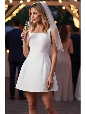 Футляр Короткое мини Белое платье Маленькое белое платье Элегантный стиль Открытая спина Без рукавов V-образный вырез Свадьба градация Эластичная ткань С открытой спиной с Рюши Один цвет