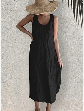 Женское платье миди из хлопка и льна повседневное летнее с свободным кроем однотонное без рукавов с U-образным вырезом черное белое розовое лето