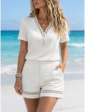 Жен. Комплекты шорт Болеро Искусственный хлопок и лен С короткими рукавами V-образный вырез Сплошной цвет Аппликация Мода Уличный стиль Повседневные на открытом воздухе Черный Бежевый Лето Стандартный
