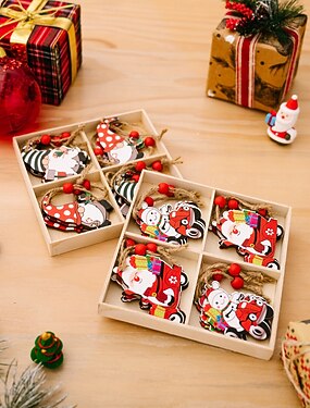 набор рождественских деревянных украшений в виде гномов, деревянная коробка с 4 ячейками и мультяшным принтом, украшения в виде Санты и гномов, подвесное украшение в виде рождественской елки