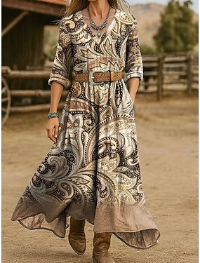 Женское миди-платье Boho платье фасона A Line для отпуска повседневное обычная посадка графический пагода рукав 3/4 воротник V синий хаки весна осень