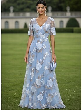 А-силуэт Платья В пол Свадебное платье для гостей Вечернее платье Платье для матери невесты С короткими рукавами V-образный вырез Элегантный стиль Простой Украшенный