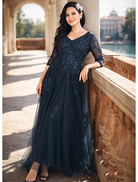 А-силуэт В пол Вышивка бисером Свадебное платье для гостей Вечернее платье Платье для матери невесты Рукав 3/4 V-образный вырез Элегантный стиль Свадебный гость Помолвка Кружева Тюль с