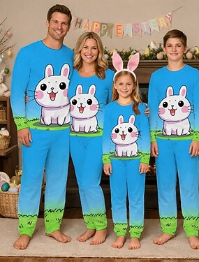 Семейный вид Пасха Пижамы Графика Кролик Повседневные С принтом Синий Длинный рукав Отпуск Подходящие наряды