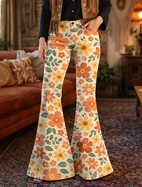 Ретро Богемный В стиле 1970-х Брюки Штаны Расклешенные брюки Хиппи Диско Завышенная Цветочный принт Маскарадный костюм Жен. Хэллоуин Карнавал музыкальный фестиваль Ретро-вечеринка Взрослые Брюки