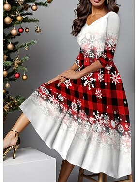Новогодняя тематика Жен. Платье средней длины Платье A-силуэта Отпуск На каждый день Для вечеринок Повседневные На выход Стандартный Графика Новогодняя ёлка В снежинку Рукав 3/4 V-образный вырез