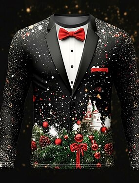 Новогодняя тематика Муж. Новогодние костюмы смокинг Футболка Длинный рукав Футболка 3D печать Вырез под горло Рубашка Мода Классический 3D Для улицы Повседневные Черный 1 Лето Весна Одежда S M L XL