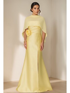 А-силуэт В пол Бальное платье с накидкой Вечернее платье Элегантный стиль Шелковистость С короткими рукавами Вырез под горло Свадьба Официальные Сатин с Кристаллы Shouder Flower