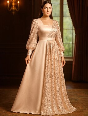 Платье A-Line до пола для гостей на свадьбу Официальные платья Вечернее платье Платье матери невесты Длинный рукав Круглый вырез Элегантное винтажное Плюс размер с пайетками цветной блок