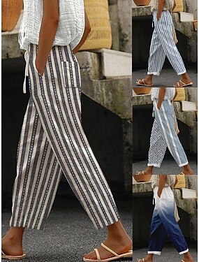 Жен. Искусственный хлопок и лен Чино Прямой силуэт Мода Уличный стиль На каждый день Полная длина Завышенная Градиент Полоса Карман Эластичный пояс С принтом удобный Мягкий Удобный Слабоэластичная