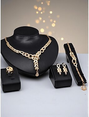 Женский комплект украшений из золотой цепочки — элегантный комплект из четырех колье, браслета, серег и кольца с узором в виде листьев для вечеринки, бала или торжественного случая