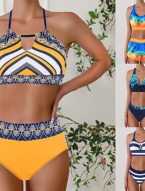 Женский бикини 2 часть купального костюма подкладка бриджи стройный без спинки отпуск винтажный полосатый V-образный вырез без рукавов купальные костюмы