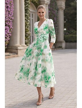 А-силуэт До щиколотки Ниже колена Цветочное платье коктейльные платья Элегантный стиль С цветами Полуформальный / Коктейльный Рукав 3/4 V-образный вырез Вечеринка в саду Свадьба Органза Жаккард с