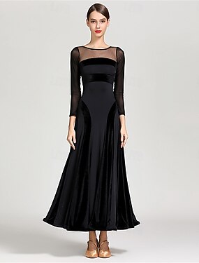 Платье для бальных танцев с прозрачными рукавами для женщин - А-силуэт с длинными рукавами и бархатной отделкой для соревнований, латиноамериканских танцев и танцевальных мероприятий - черное