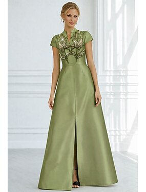 А-силуэт В пол Вышивка бисером Вечернее платье Платье матери невесты Вечернее платье Торжественное платье Элегантный стиль Блестящие Шелковистость С короткими рукавами V-образный вырез