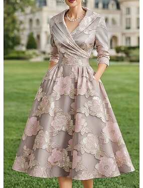 А-силуэт До щиколотки Платье для вечеринки Коктейльные платья Свадебное платье для гостей Платье для матери невесты Рукав 3/4 V-образный вырез Элегантный стиль Винтаж