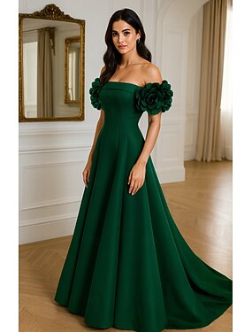 А-силуэт В пол Вечернее платье С пышной юбкой Торжественное платье Элегантный стиль Маленькое черное платье Шелковистость С короткими рукавами С открытыми плечами Свадьба Официальные Накидка Сатин с
