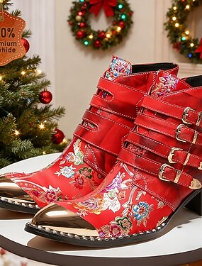 Мужские ботильоны из натуральной коровьей кожи красного цвета с цветочным принтом и пряжкой – готический панк-стиль для сцены и модных вечеринок