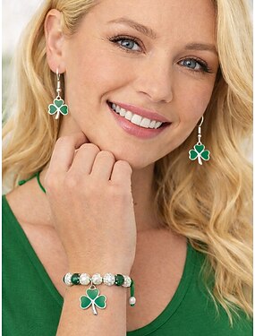 Женский браслет и серьги из сплава и акрила в виде клевера, украшенные зелеными и белыми бусинами, идеально подходят для Дня Святого Патрика и для повседневной носки.