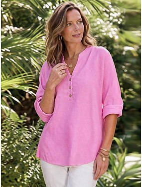 Жен. Блуза Искусственный хлопок и лен Пуговицы Сплошной цвет Классический На каждый день Длинный рукав V-образный вырез Обычные топы Повседневные Синий Белый Розовый Зеленый Лето Весна Осень