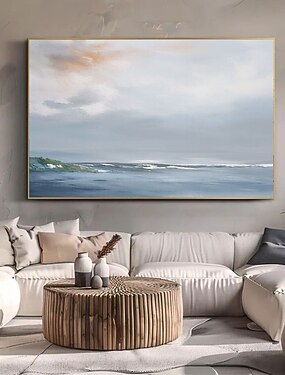 Картина маслом, ручная роспись, голубое небо и белые облака, картина, ручная работа, морское абстрактное искусство, светло-коричневая пляжная картина, светло-голубое небо, облака, современная