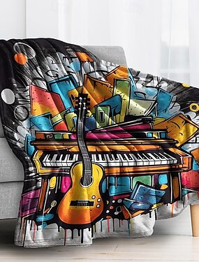 Плед с изображением пианино, музыкальных нот, черно-белый музыкальный узор, мягкий флисовый плед для дивана, кровати, кресла, музыкальной комнаты.