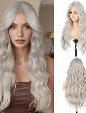 Длинный волнистый серый парик с челкой-занавеской для женщин, 26-дюймовый серебристо-серый синтетический парик из термостойкого волокна с естественным видом, для ежедневного использования в косплее и