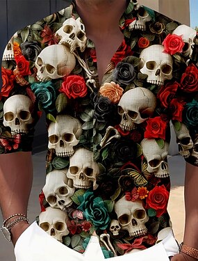 Мужские Костюмы Черепа Рубашка С Пуговицами Повседневная Рубашка Длинный Рукав Темный Готический Стиль Отпуск Летний Весна С Отворотом 3D Печать Рубашки С Цветным Воротником Чёрная Белая Тёмно-Синяя