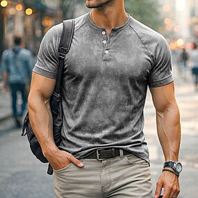 Муж. Футболки Хенли Топ Футболка из хлопка Постиранная рубашка С короткими рукавами Сплошной цвет Полотняное плетение Винтаж Оригинальный рисунок На каждый день Блеклый Пуговицы Хенли