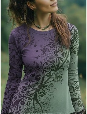 Жен. Бохо Рубашка Футболка С принтом Цветочный принт Графика Богемия Винтаж На каждый день Длинный рукав Вырез под горло Обычные топы Повседневные выходные Одежда для отпуска Лиловый Лето Весна Осень