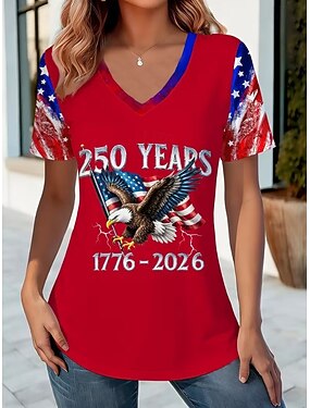 День независимости Американская годовщина Патриотическая Женская футболка с принтом Графический флаг Винтажный Стильный Классический Короткий рукав V-образный вырез Обычные топы Повседневные Красный