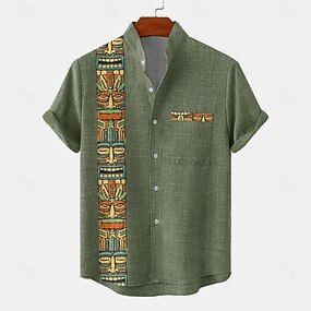 Муж. Рубашка Кнопка рубашка С короткими рукавами Винтаж На каждый день Туземные Отпуск Повседневные Лето Весна Воротник-стойка дедушкин воротник С принтом Темно-зеленый Зеленый Хаки
