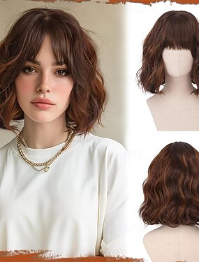 Черный парик смешанного коричневого цвета с челкой, короткий волнистый боб-парик для женщин, синтетические волосы до плеч, естественно выглядящий кудрявый парик, термостойкий парик-каре (14 дюймов)