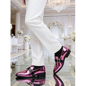 Мужские розовые лакированные туфли-монки с черными акцентами — модная обувь для торжественных мероприятий и свадеб.
