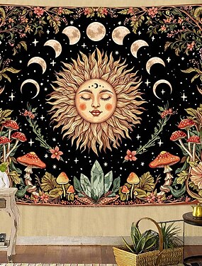 Гобелен с изображением фаз солнца и луны, гриба, кристалла, настенное украшение в стиле коттеджкор, ведьминский декор комнаты, йога, медитация, домашнее искусство, тканевый постер