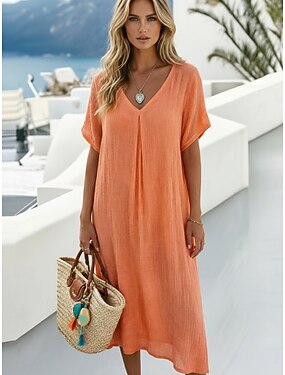 Жен. Платье средней длины Платье из хлопка и льна Мода Современное на открытом воздухе Отпуск Праздники Свободное облегание Полотняное плетение С короткими рукавами V-образный вырез
