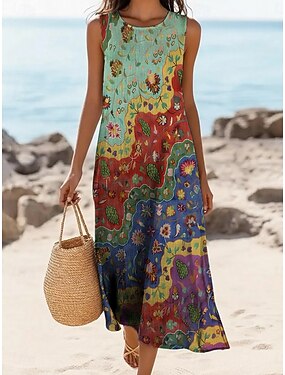 Жен. Платье средней длины Искусственный хлопок и лен Платье прямого кроя Сарафан Повседневное платье Винтаж Повседневные на открытом воздухе Пляж Стандартный Цветочный принт Без рукавов