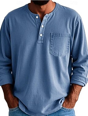 Муж. Рубашка Хенли Футболки Рубашка из 100% хлопка с кислотной стиркой Хенли Топ Длинный рукав Сплошной цвет Полотняное плетение Винтаж Мода Ретро Блеклый Пуговицы Хенли