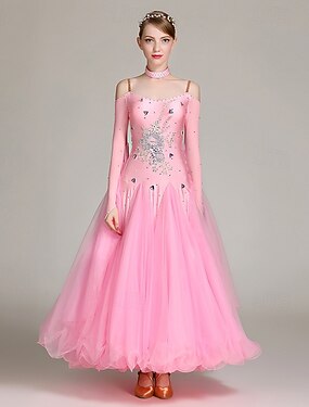 Женское платье для бальных танцев, украшенное стразами, с открытыми плечами, многослойное, из тюля, элегантное, для выступлений вальс, танго, фокстрот, светло-розовое
