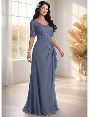 А-силуэт В пол Свадебное платье для гостей Вечернее платье Платье для матери невесты Рукав до локтя V-образный вырез Элегантный стиль Свадебный гость Помолвка Шифон с Плиссировка Аппликации