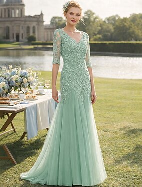 А-силуэт С коротким шлейфом Свадебное платье для гостей Вечернее платье Платье для матери невесты Рукав до локтя V-образный вырез Элегантный стиль Свадебные прием Кружева Тюль Нет с Оборки Аппликации