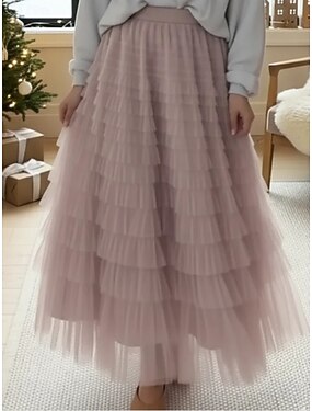 Жен. А-силуэт Элегантный стиль Макси Нормальная Подол Многослойный Неэластичная Винный Черный Розовый Коричневый Весна Тюль