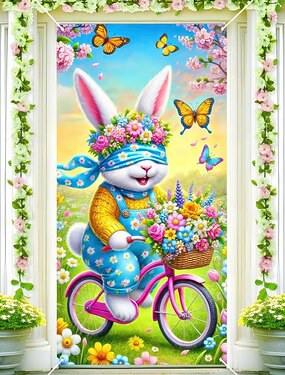 Наклейка на дверь с пасхальным кроликом: весёлый кролик с завязанными глазами и цветочным венком, едущий на велосипеде, бабочки и весенний декор, идеально подходит для украшения дверей и улицы к
