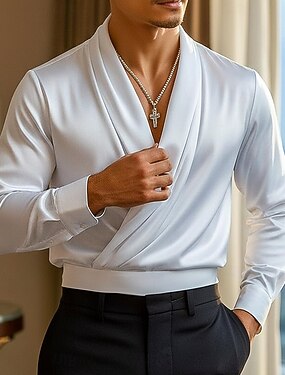 Муж. Рубашка Шелк как Атласная рубашка Повседневная рубашка Выпускная рубашка Полотняное плетение Официальные Свадьба Черный Белый Длинный рукав V-образный вырез Все сезоны Одежда