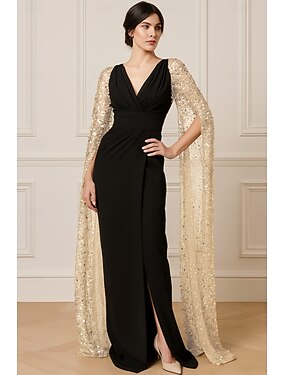 Футляр В пол Выпускные платья Вечернее платье С пышной юбкой Торжественное платье Элегантный стиль Блестящая Высокий раскол Длинный рукав V-образный вырез Свадьба Официальные Карман