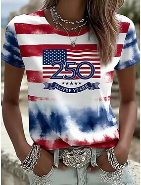 День независимости США Жен. Футболка С принтом Графика Флаг Буквы Винтаж Стиль Классика С короткими рукавами Вырез под горло Круглый вырез Обычные топы Повседневные Синий Белый Красный / синий