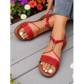 женские красные босоножки на плоской подошве – удобная летняя обувь с металлическими вставками для пляжных, парковых и садовых вечеринок