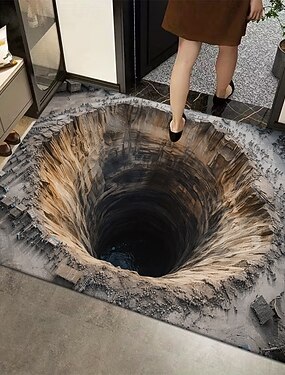 Трехмерный коврик с оптической иллюзией, глубоким отверстием и эффектом потрескавшегося камня, двухмерная плоская печать для эффектного украшения прихожей.